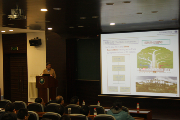 李院士本次的讲座以铯原子钟与时间频率测量为主题,通过简要介绍六个物理基本量的定义,使学生们了解到米的1983年新的定义和测量方法、时间的科学概念及原子秒的定义等内容,并讲解了冷原子的物理基础、铯原子喷泉钟的原理及特点等知识。在讲座的后半段着重介绍了中国计量研究所的科研成果及目标。
